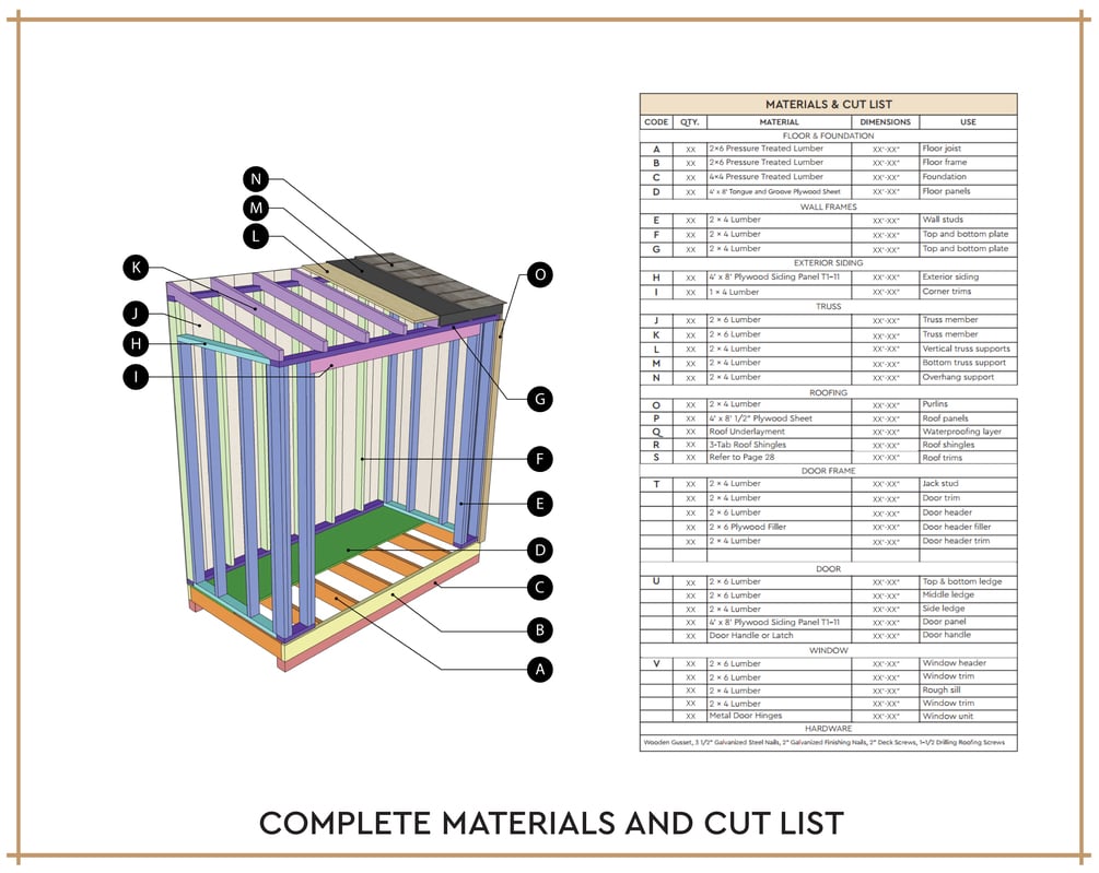 This is the complete 4x8 Lean To Shed Plans including everything you need to build a sturdy and beautiful lean to shed. Measurements are in imperial units, instructions are concise and made for all skill levels from beginners to expert DIYers. The plans are designed to be efficient, helping you to save on materials and time. You can easily modify the plans to fit your requirement.