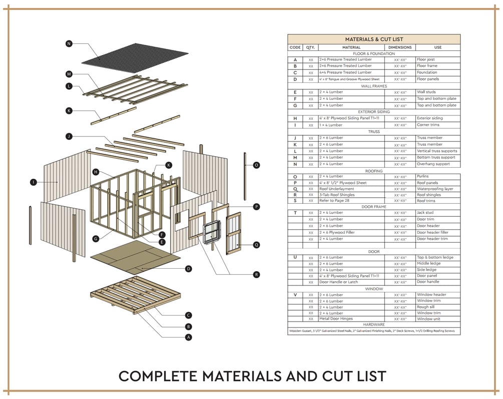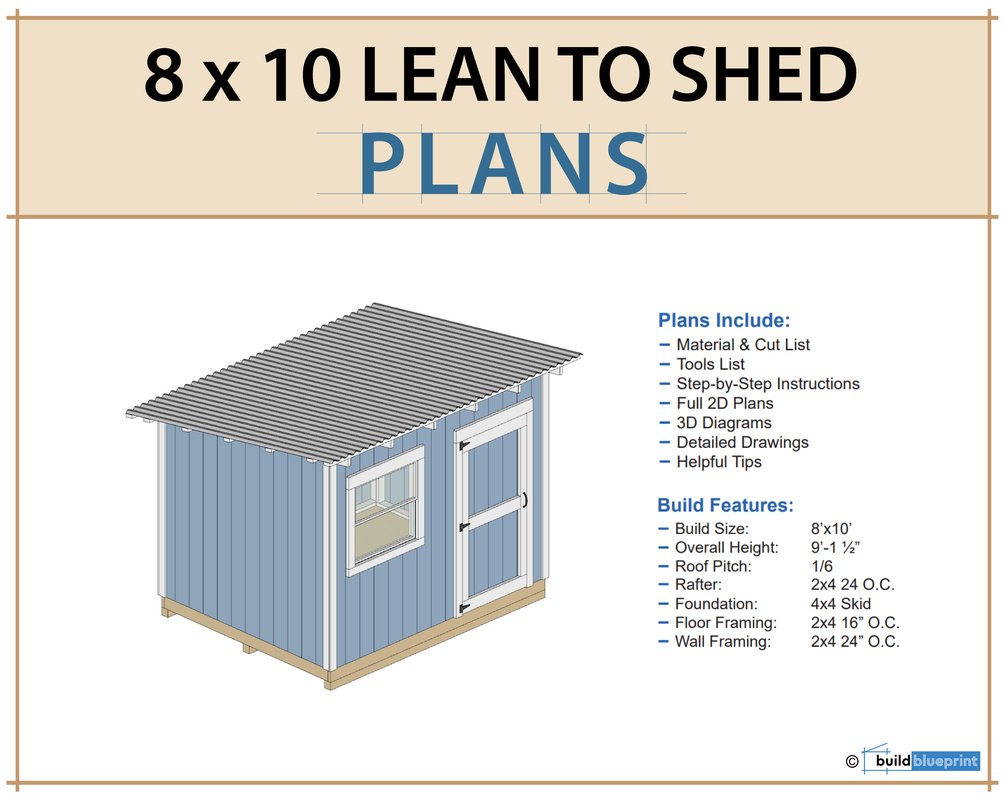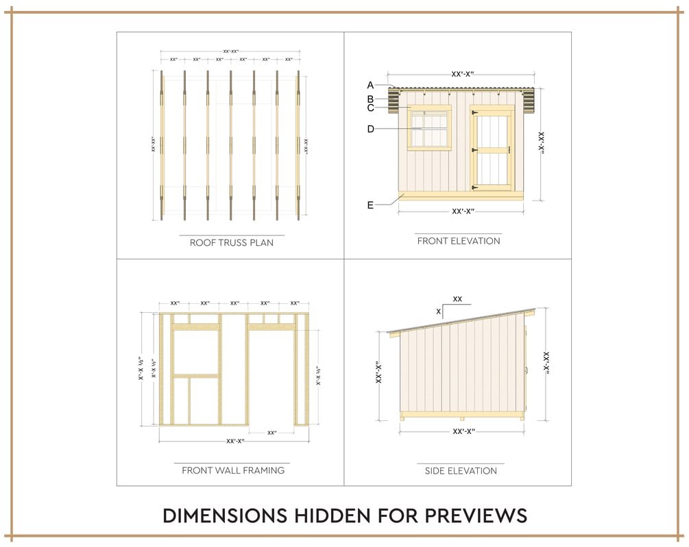 This is the complete 8x10 Lean To Shed Plans including everything you need to build a sturdy and beautiful lean to shed. Measurements are in imperial units, instructions are concise and made for all skill levels from beginners to expert DIYers. The plans are designed to be efficient, helping you to save on materials and time. You can easily modify the plans to fit your creative endeavors!